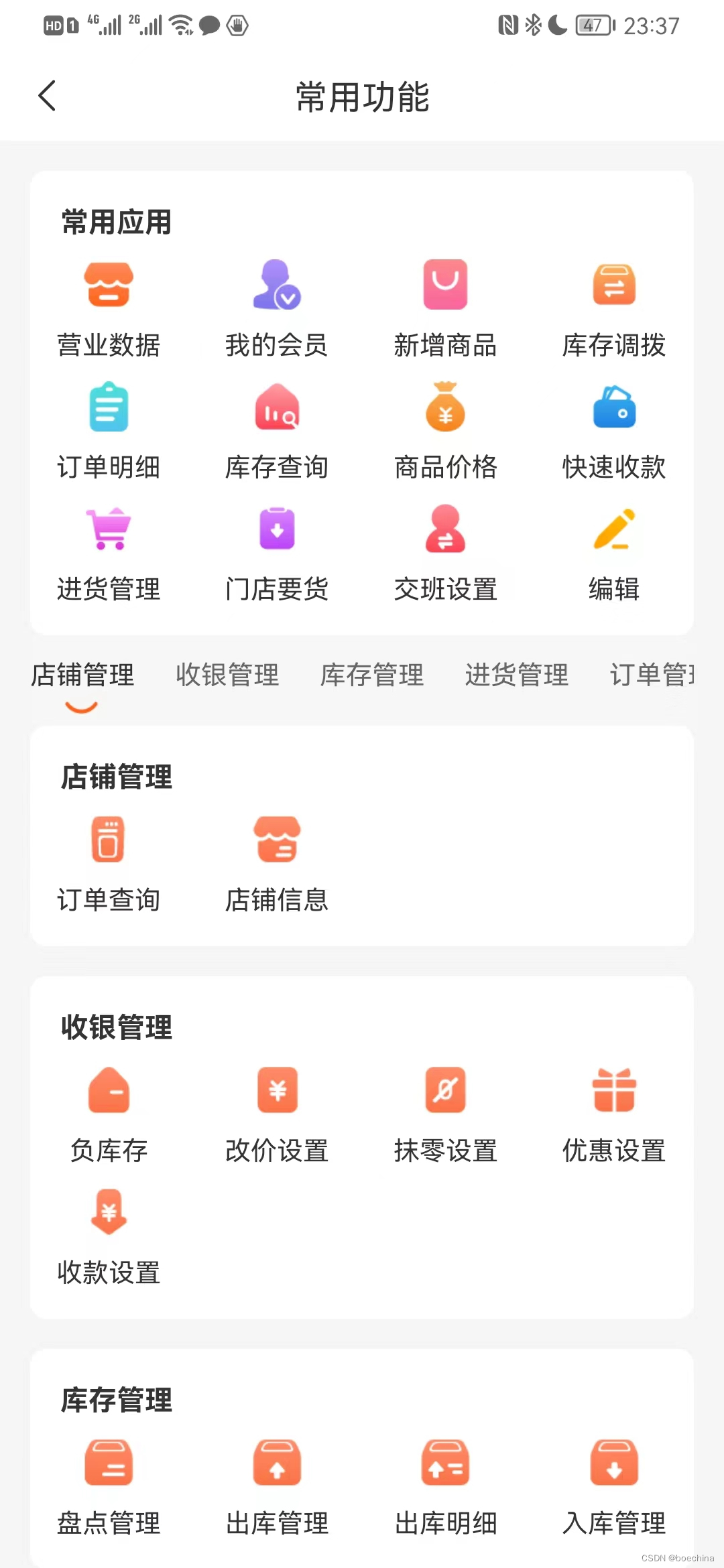 首页显示了今日关键数据指标的统计,以及常用功能的icon,常用功能可自定义。
